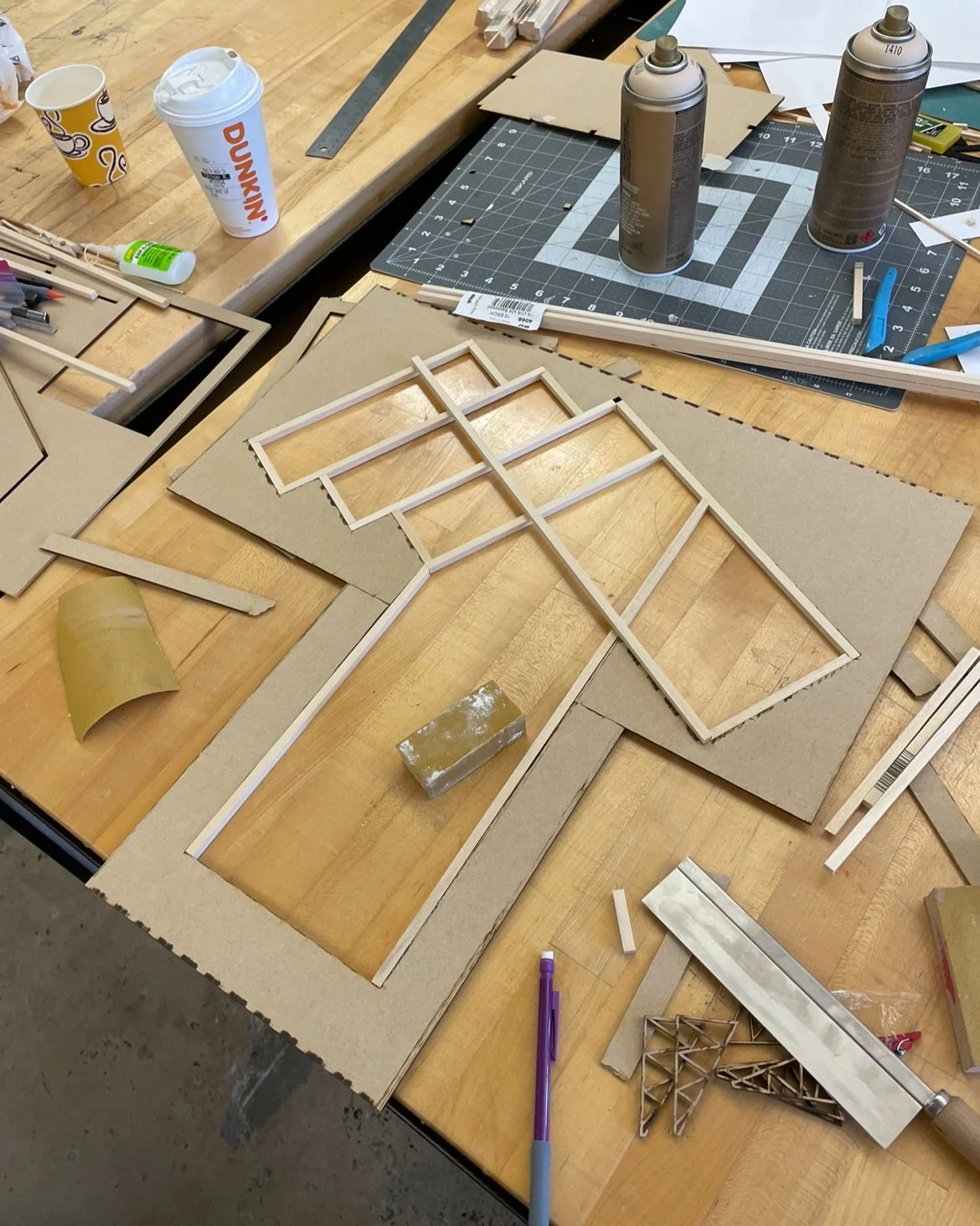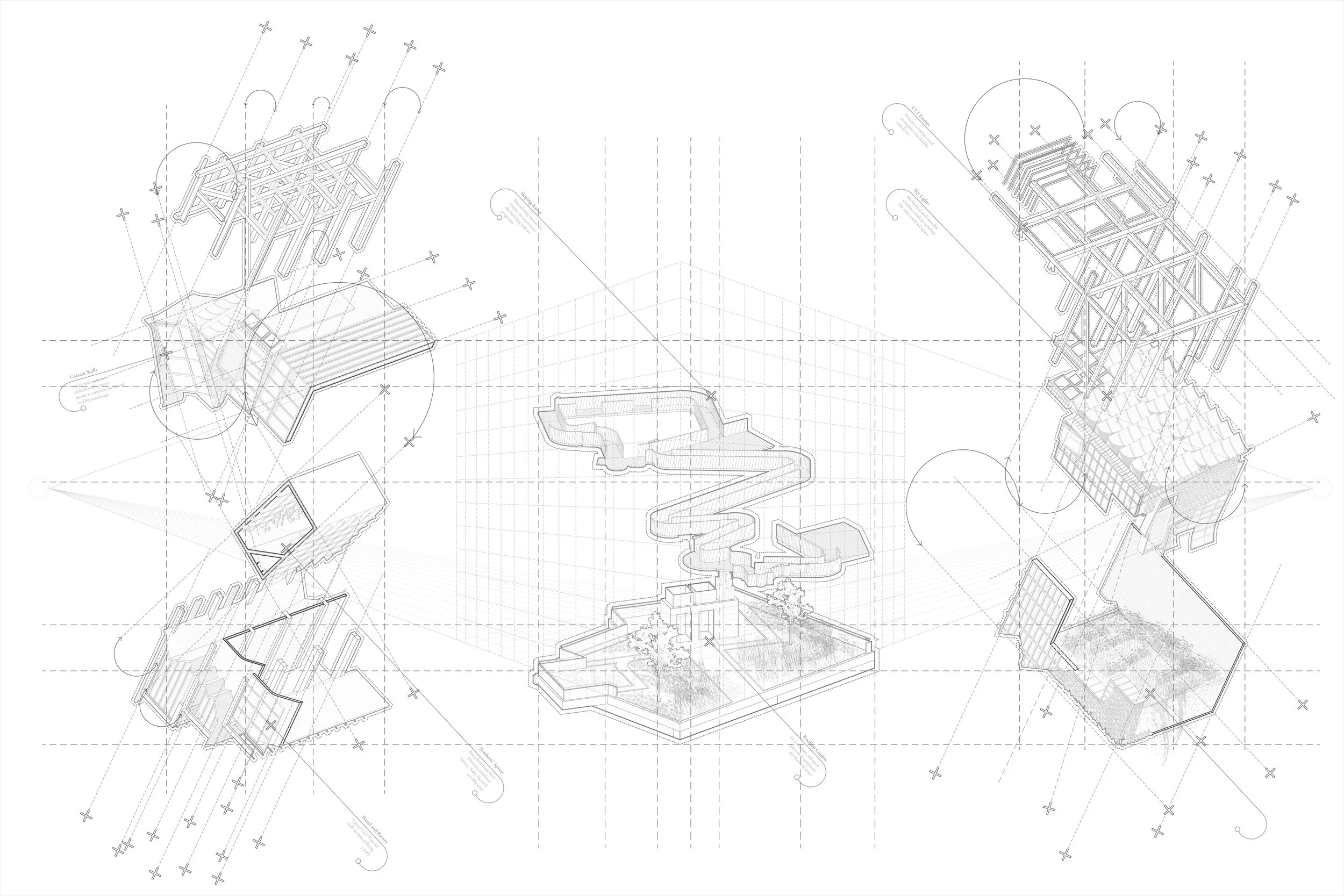 Subdivisions and shifts in the structure influenced the curation of the facade systems as well. The coffering and board and batton systems at certain points align or intentionally rotate and misalign with the Primary Structural frame. This overlap starts to play with the facades’ relationship between pattern and structure. Serving as a sort of infill within these systems Angled two by fours are incorporated into the facade of the building and respond to the frames that they are placed on. Our primary focus, however, lies not in the aesthetic repercussions of this cladding system, but rather in facilitating the propagation of bees on the exterior. By strategically placing these angled two-by-fours, we provide ample opportunities for vines to grow and intertwine, creating a natural habitat for bees. Vines such as Virginia Creeper, Boston Ivy, and Honeysuckle thrive in the region and their distribution will vary based on the season. This symbiotic relationship between the angled structure and the vine growth fosters an environment conducive to bee activity, aiding in pollination and ultimately contributing to the preservation of these vital pollinators.