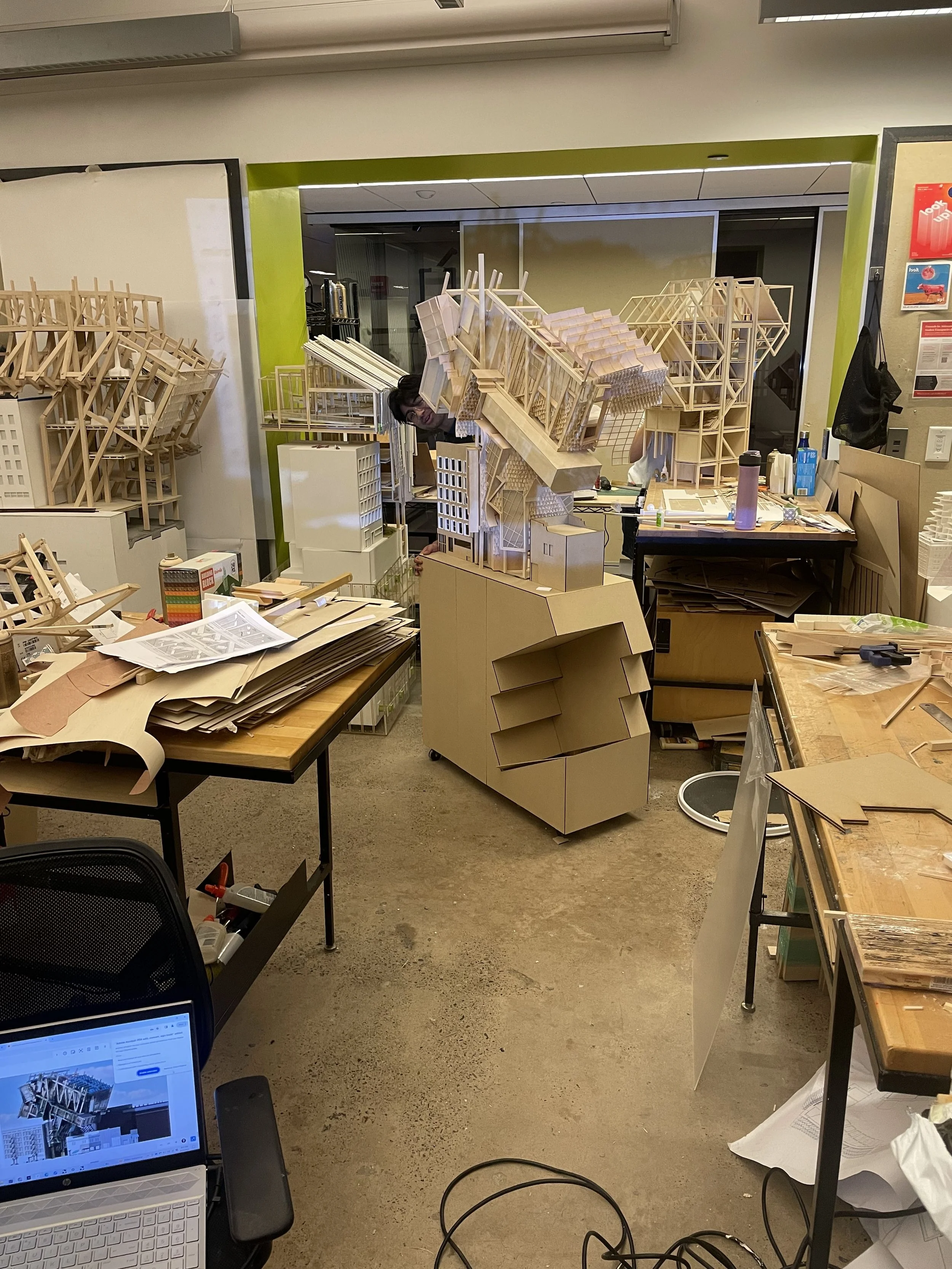 Massing gif showing Double cantalever condition utilizing air rights of neigboring buildings