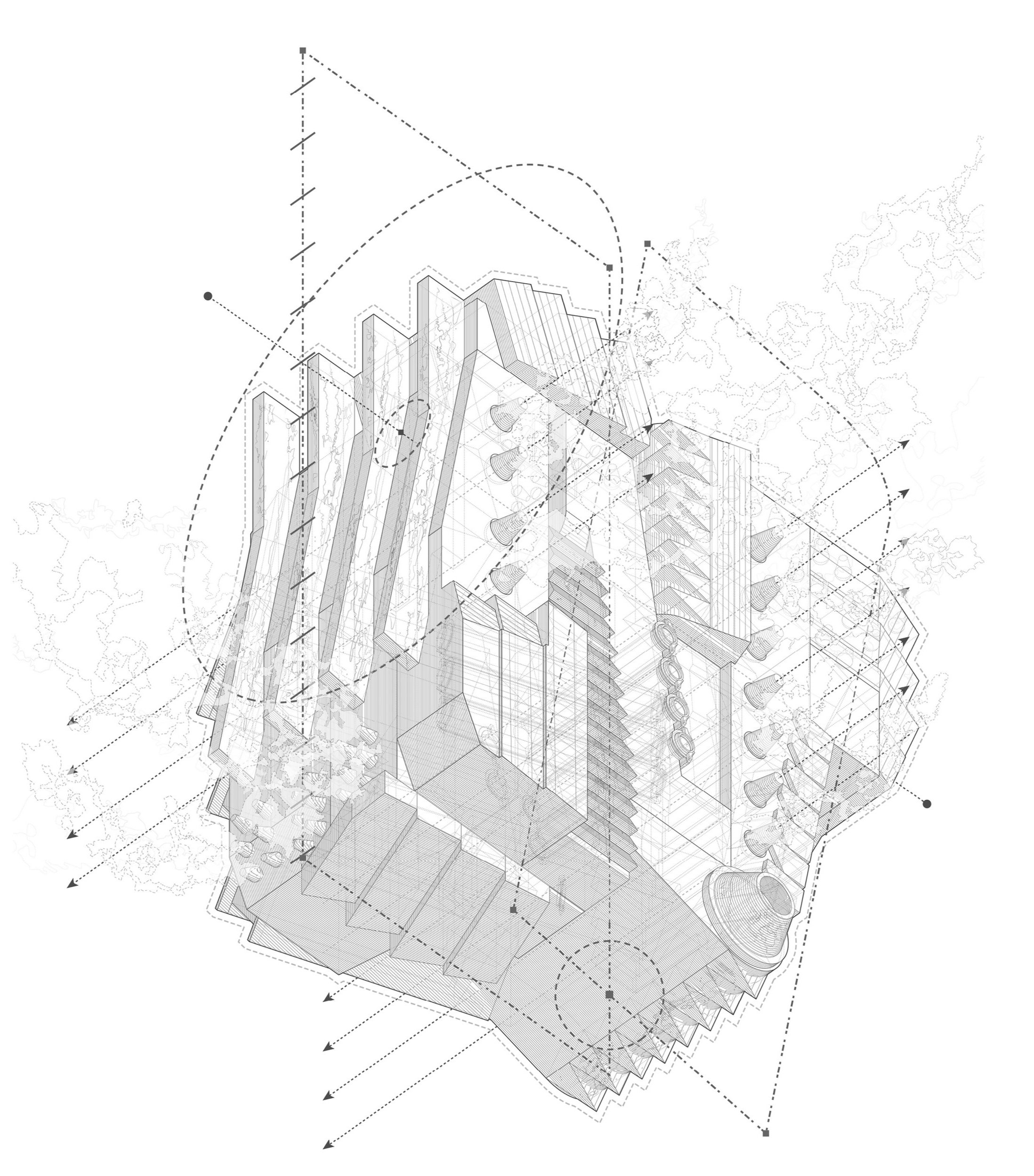 Exploded Axonometric: Worms eye Exposing the two dimensional figures withing the assemblege