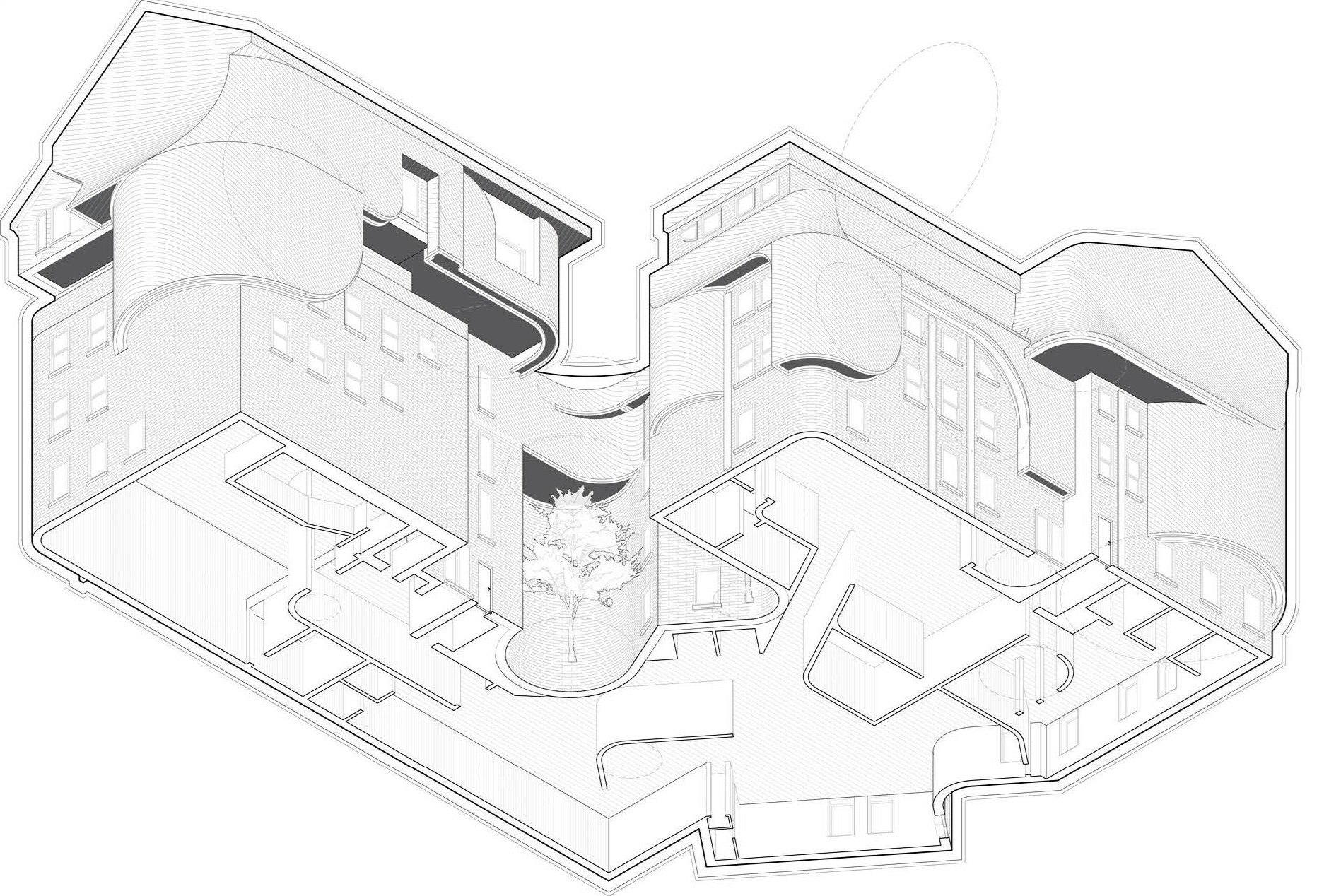 Domestic Intersections integrates housing opportunities with social interaction, job placement, and community support for its refugee occupants as they transition into life as Philadelphians. The building draws from the forms and materials commonly found in the surrounding architecture, creating a harmonious relationship with its context while still offering unique and functional spaces for residents. Rather than prioritizing maximum efficiency, like many nearby apartments, this project tailors its floor plans to accommodate familial living situations. Internally, the building provides flexible and adaptable living spaces designed to meet the needs of its diverse residents.