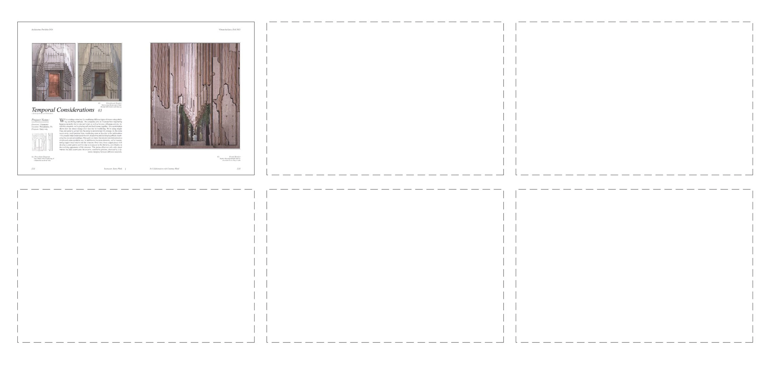 This structure illustrates natural and human-driven weathering by combining soft and hard stones, which erode at different rates. Carved lines guide this process, forming pockets that highlight weathering’s varied effects. Copper inserts will develop a green patina over time, further emphasizing material transformation. The design showcases weathering as an evolving interplay of elements, making the process visually clear and engaging.