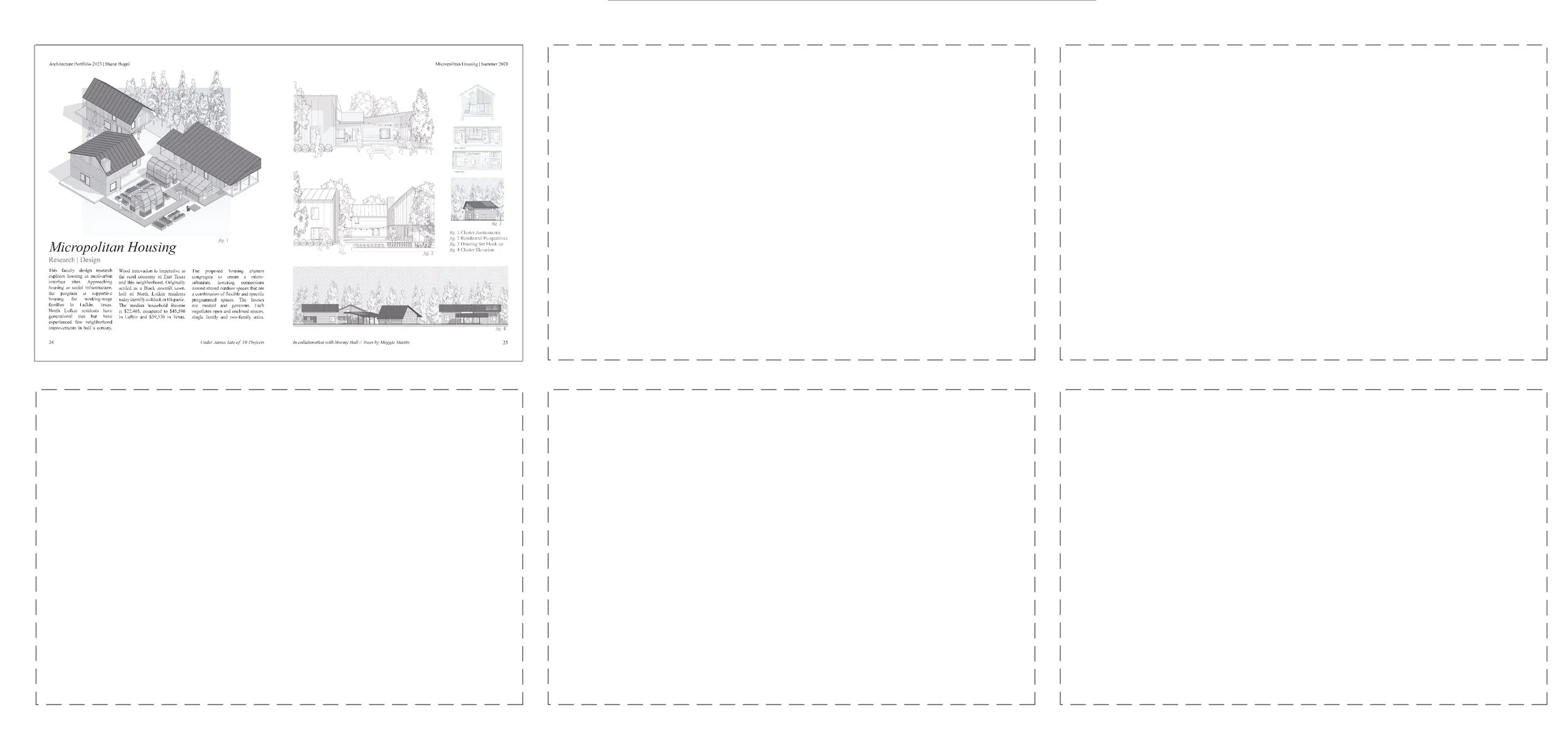 Approaching housing as social infrastructure, the program is supportive housing for working-wage families in Lufkin, Texas. North Lufkin residents have generational ties but have experienced few neighborhood improvements in half a century. The proposed housing clusters create a micro-urbanism, fostering connections around shared outdoor spaces that are a combination of flexible and specific programed spaces.